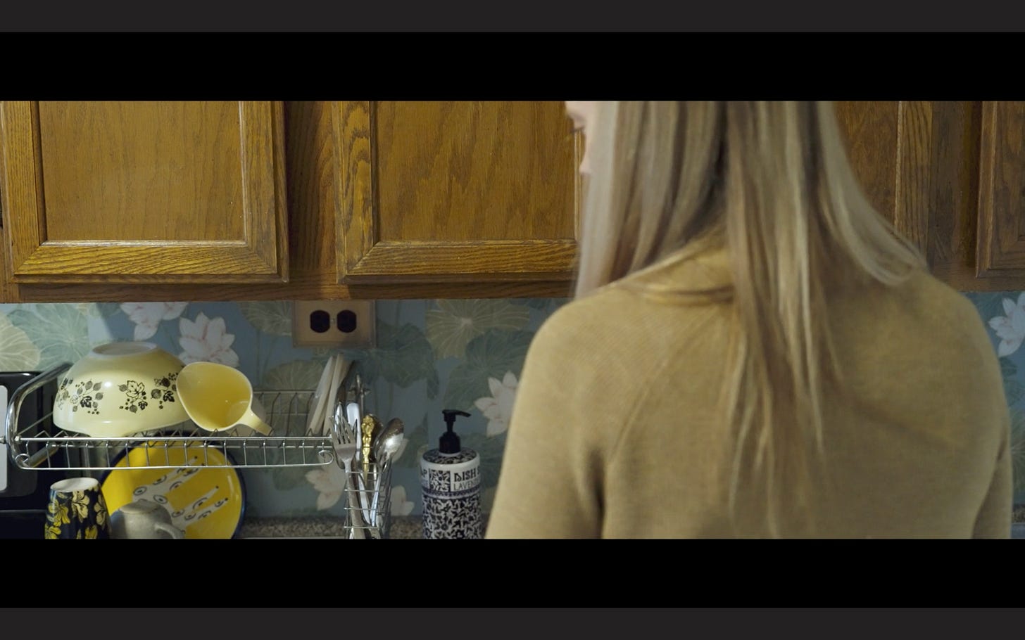 MAS (another lady, apathetic but present) comes in and leaves a mug on the counter next to the sink.